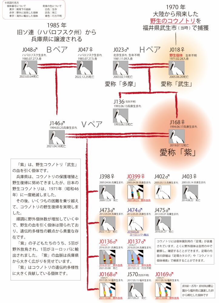 J018(メス)は、昭和46年(1971年)に自然界で捕獲され、現在の附属飼育施設コウノトリ保護増殖センターへ移送された野生の血を引くコウノトリ(通称:武生)です。J018の2羽の子のうち、ペアを形成し、繁殖に成功したのは、J168(オス)だけです。そのため、J168のペアから孵化したコウノトリは、その後の放鳥や国内外の動物園への譲渡個体に選ばれるなど、コウノトリの遺伝的多様性に大きく貢献しています。